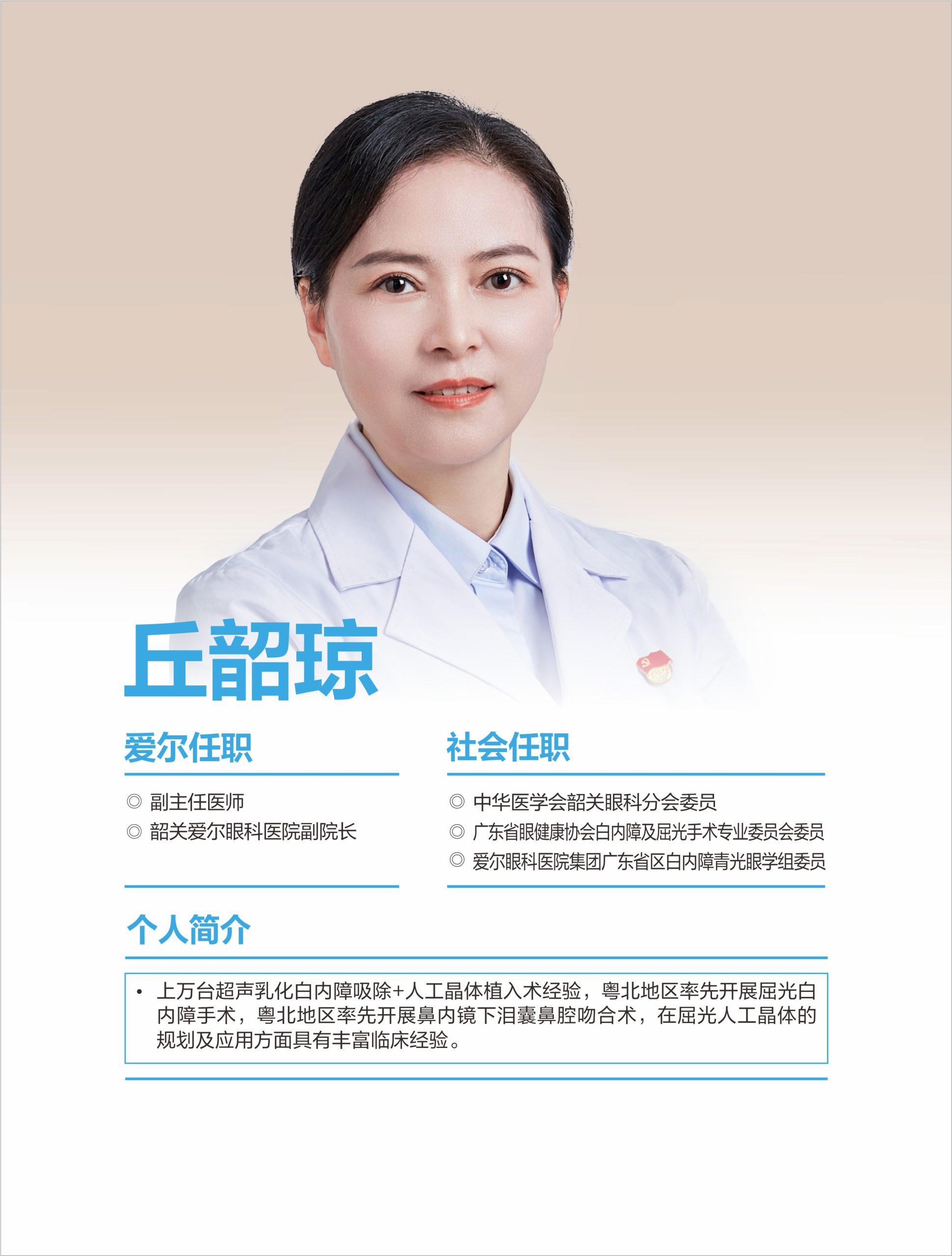 韶關愛爾眼科醫院有限公司白內障團隊擁王愛琴院長(愛爾眼科粵北區)、丘韶瓊院長、郭俊豪主任等多位??漆t生,具備同步國際的白內障手術能力,能熟練開展各項常規及疑難白內障手術。 可開展微切口煥晶白內障手術,植入多焦晶體或多焦+散光矯正晶體,在治療白內障同時同步解決遠視/近視、老花眼、角膜散光等屈光問題,醫生手術經驗豐富,為眾多患者帶來更舒適的視覺。